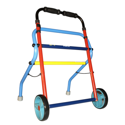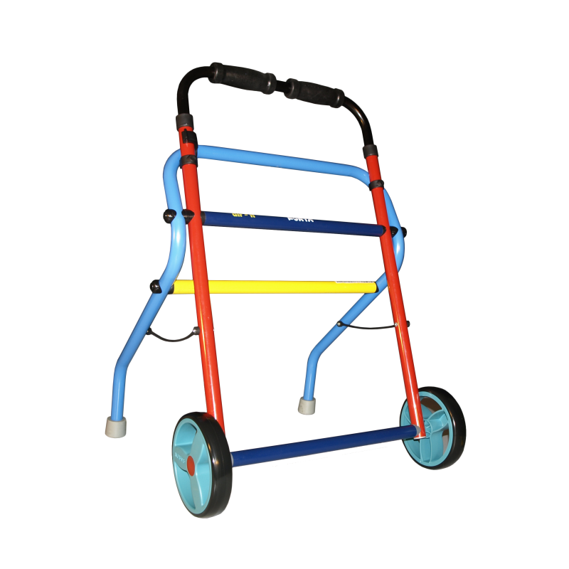 Andador infantil de aluminio con empuñaduras de goma en arco, regulable en altura desde 63 cm hasta 72 cm y de fácil plegado.